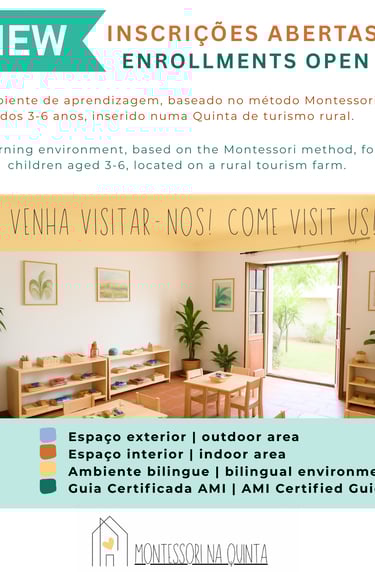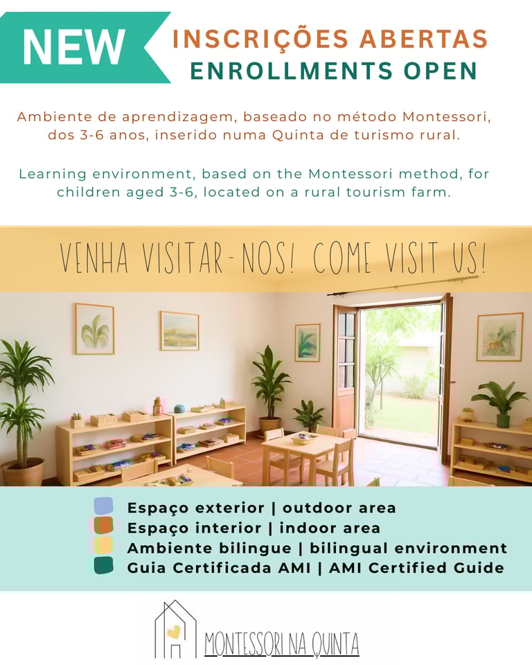 Num lugar muito muito especial, está a nascer um ambiente Montessori completamente preparado para crianças dos 3-6 anos. Inserido numa Quinta de turismo rural, o contacto com a natureza vai estar de mãos dadas com a essência de um método de aprendizagem centrado na criança, permitindo que cada criança, se desenvolva ao seu próprio ritmo, num ambiente seguro, respeitador e em contacto com a natureza.
